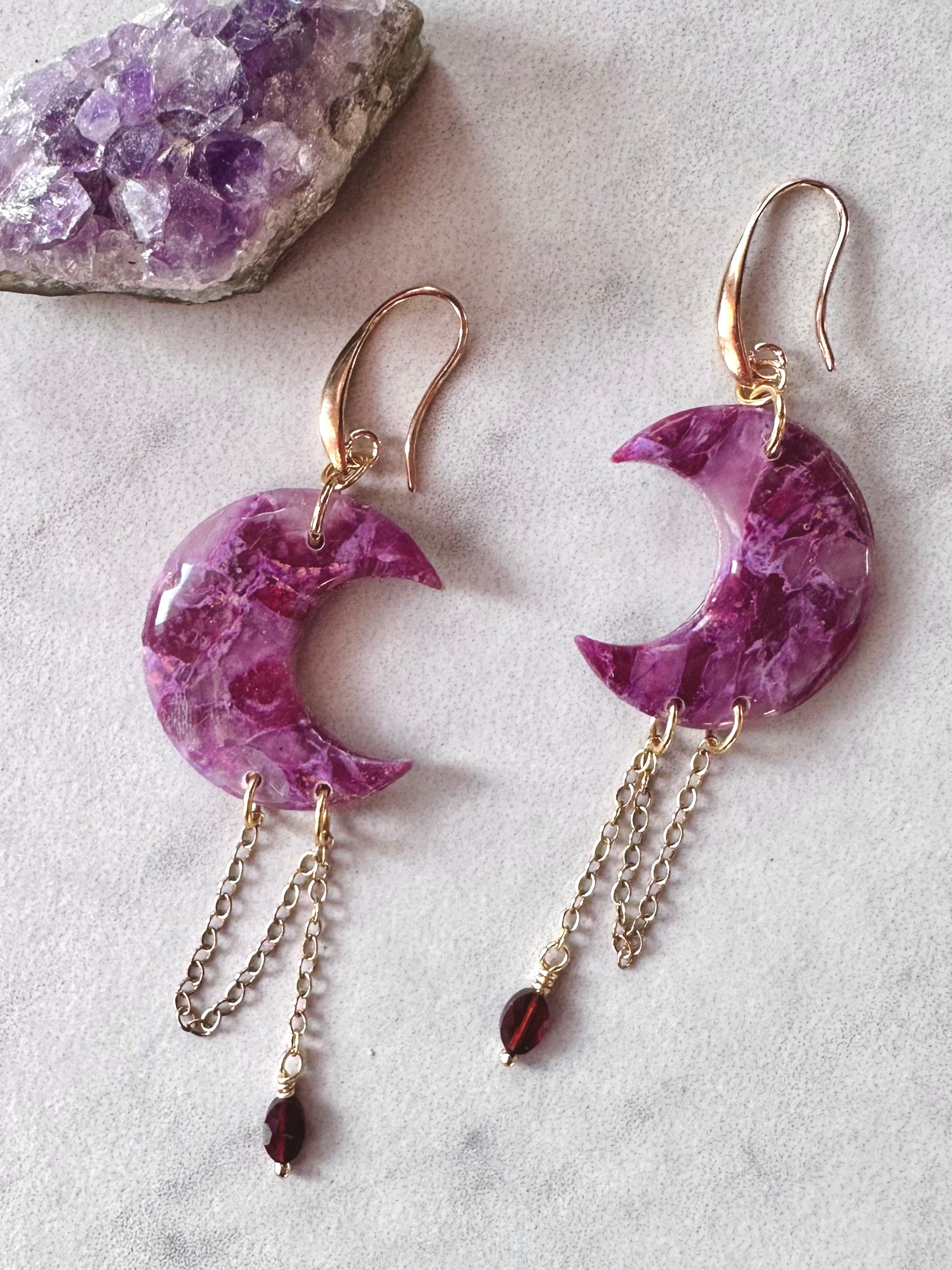 These kinetic polymer clay earrings are for the lover of deep red/pink wine colors! They feature translucent crescent moons sealed with resin for a beautiful glossy shine. Suspended from beneath on draped chain are perfect, sparkly, faceted 4x6mm oval garnets for a robust monochromatic look. The chain and the findings are genuine 18K gold plate.
